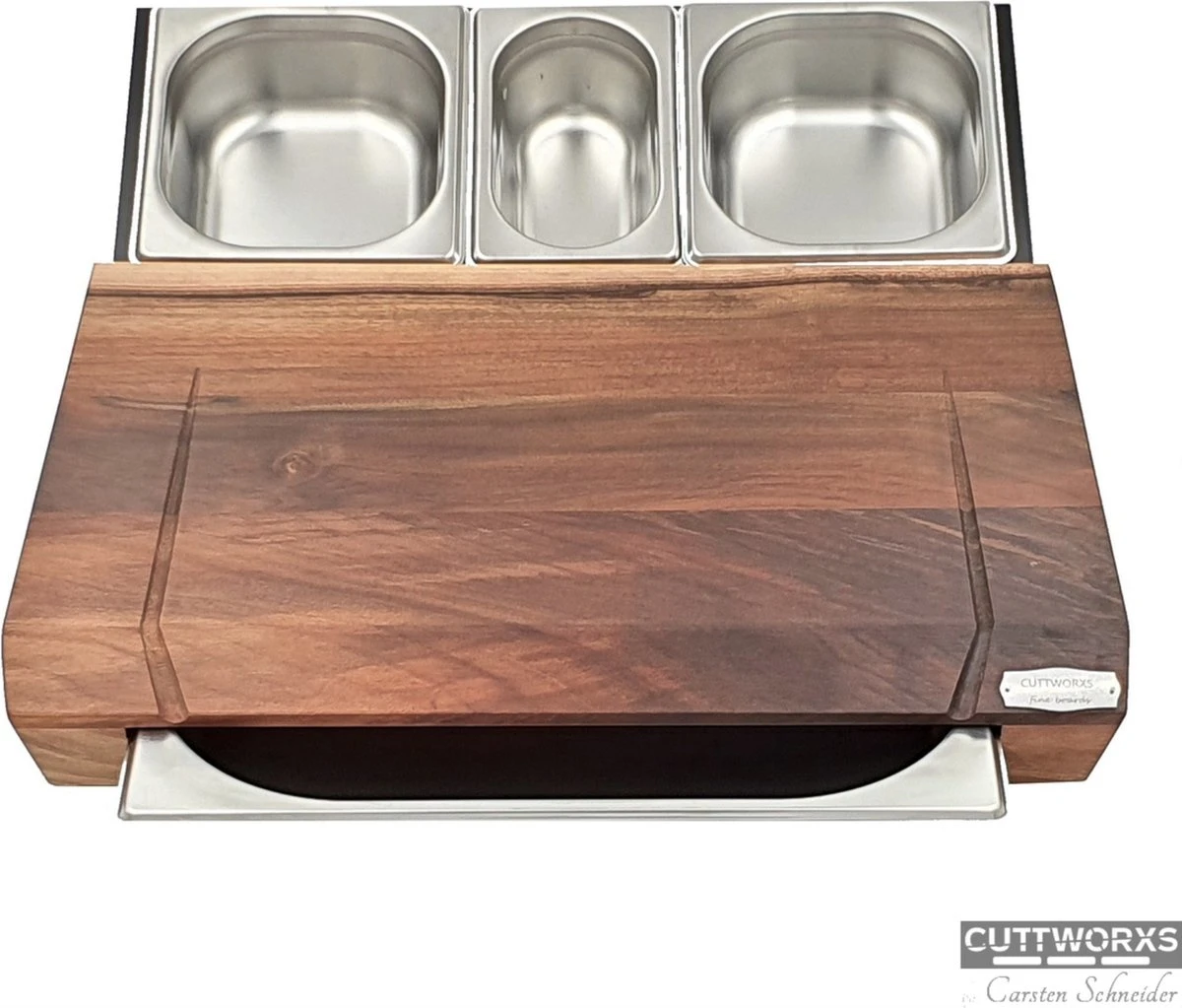 Het is een snijplank, werkplaats en werkplek in één. Het bovenblad is vervaardigd van hoogwaardig notenenhout. En is een absolute “must have” voor veeleisende gebruikers die een functionele en schone werkplek wensen voor het bereiden van gerechten. Bijna geen enkele ander keukenaccessoire is zo stijlvol als de Bloxxwork Infinity Snijplank met de geintegreerde gastronorm opvangbak.