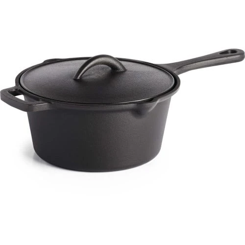 Deze gietijzeren sauspan met deksel past perfect op branders en infrarode zijbranders, maar is ook geschikt voor de barbecue of oven en kan daarna meteen op tafel gezet worden. Makkelijk te hanteren en verplaatsen dankzij de robuuste handgreep. Handige schenktuiten om jus perfect uit te schenken. Geen enkele binnen- of buitenkeuken is compleet zonder een gietijzeren sauspan met deksel.