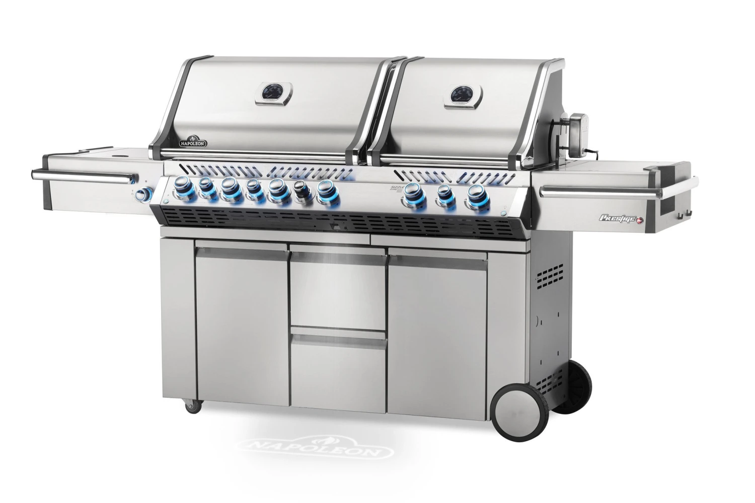 De Napoleon Prestige PRO 825-3 gas barbecue is een luxueuze gas barbecue van Napoleon. Deze barbecue heeft maar liefst 10 branders en een grill oppervlak waar 51 hamburgers tegelijk op bereidt kunnen worden! Deze barbecue heeft een krachtige zijbrander en infrarood onder- en achterbranders. De glanzende RVS behuizing is bestendig tegen alle weersomstandigheden en zorgt ook voor een luxe uitstraling. De bedieningsknoppen komen in vrijwel onbeperkte kleuropties. En als extra veiligheidsfunctie lichten ze rood op als het gas per ongeluk aan blijft staan. De hoofdgrill kan worden omgezet in een smoker met de geïntegreerde smokerbuis en speciale brander. De tweede inbouwgrill is uitgerust met twee keramische infraroodbranders die in enkele seconden een hoge temperatuur bereiken, ideaal voor het afgrillen van steaks. Ook is de Prestige PRO uitgerust met een tweetraps power-zijbrander met een, perfect voor sauteren en het maken van sausen en bijgerechten.