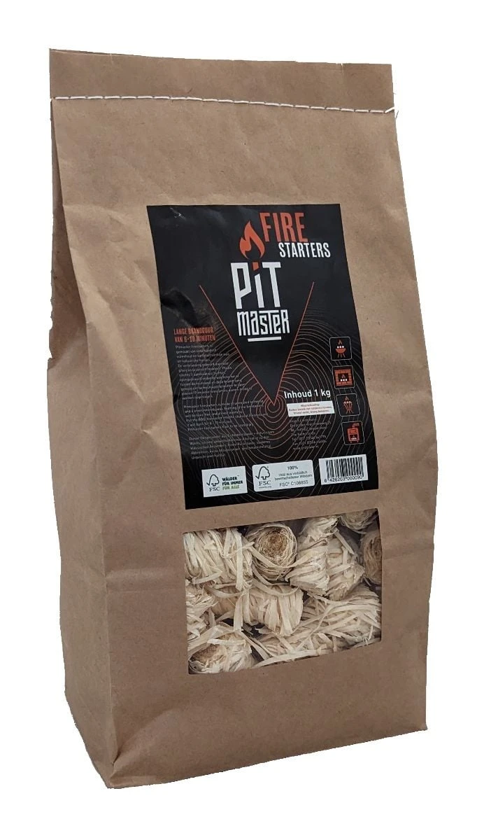 aanmaak krullen van geschaafd vurenhout en voorzien van een waslaagje. Vatten snel vlam en branden lang genoeg om bijvoorbeeld het houtskool of de briketten te laten ontbranden. Ook uitermate geschikt om de kachel, open haard of pizza oven aan te steken.